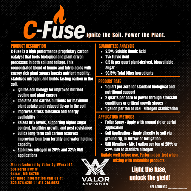 C-Fuse is an elite soil and foliar performance product engineered to amplify microbial life, enhance nutrient uptake, and improve plant vigor. Formulated with 0.5 lbs of premium, bioavailable sugar per quart, expertly chelated humic and fulvic acids, and natural surfactant-like properties, C-Fuse delivers a powerhouse combination of carbon energy and biological activation in every drop.